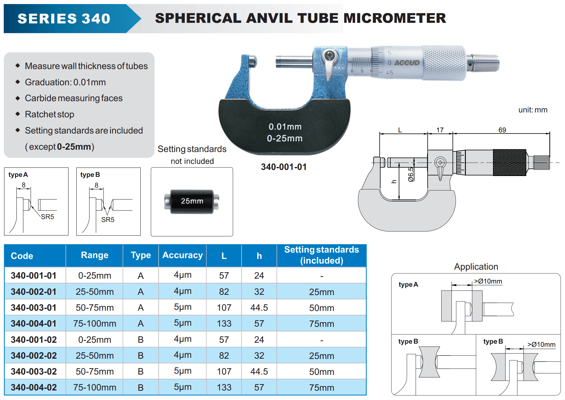 340-001-01 MICROMETER 0-25mm TUBE SPHERICAL ANVIL, A TYPE (0.01mm)