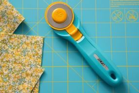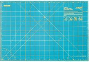Designed for crafters, OLFA self-healing rotary mats are 1,5mm thick, double sided, triple layer mats with an aqua color and yellow grid lines with a metric grid on one side and an inch grid on the other. Grid lines are designed for easy measuring and for accurate cutting of straight lines and precise angles.