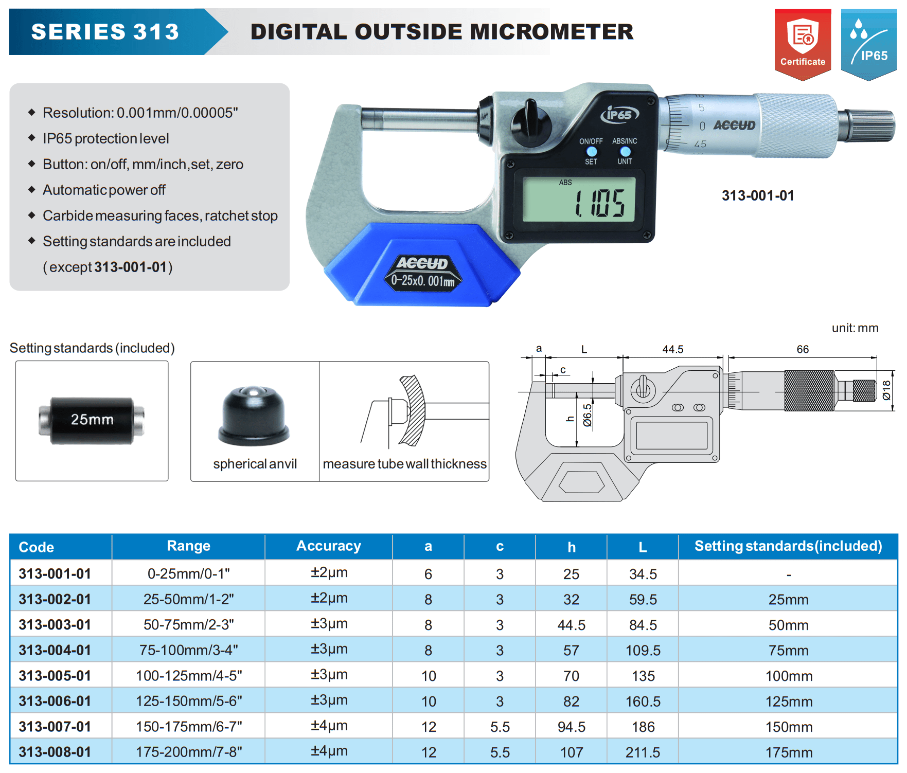 | Cat No | Range | Accuracy | a | c | h | L | Setting Standards |