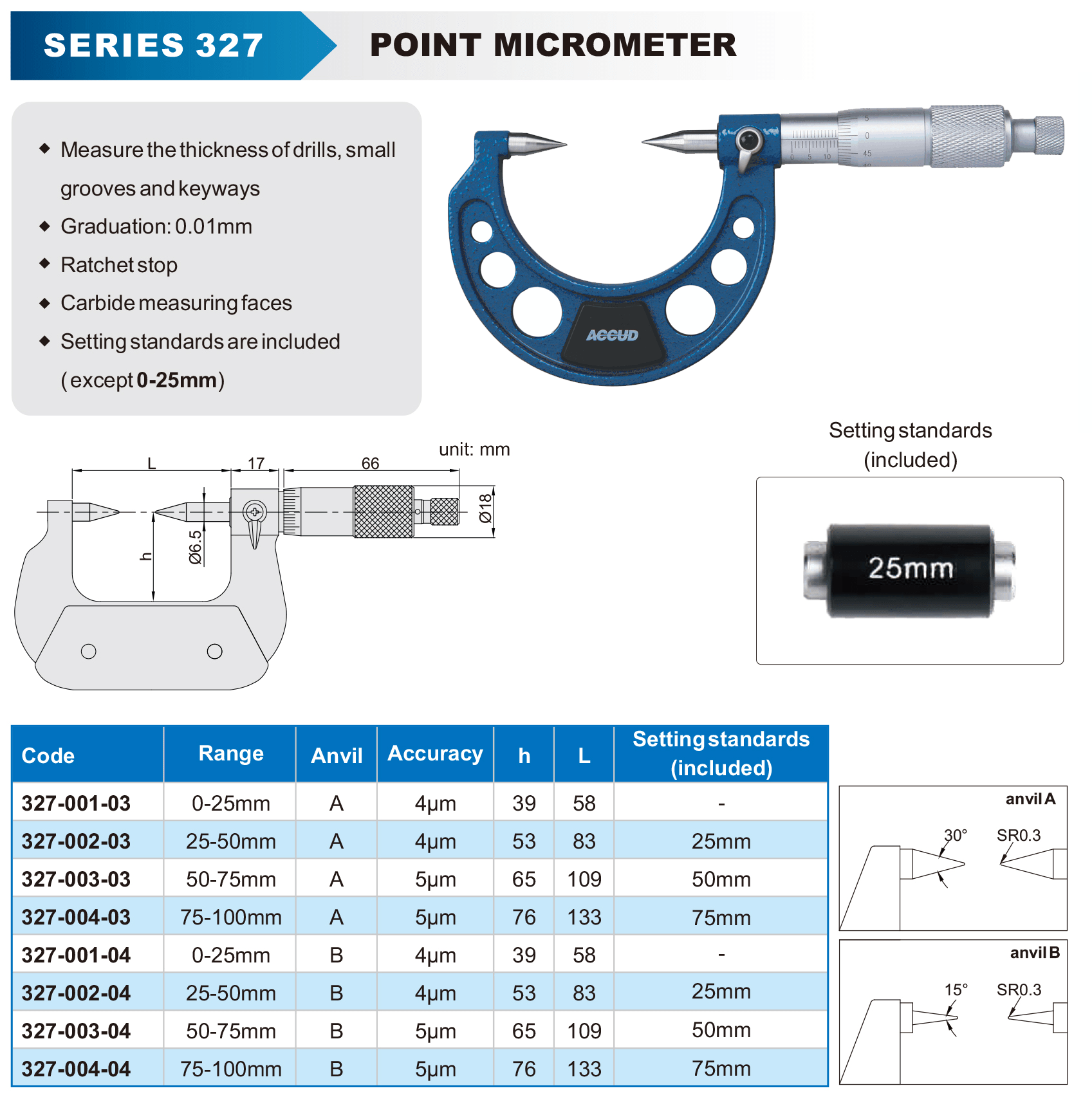 Point Micrometer 25mm 15 Deg. 0.004mm Acc. 0.01mm Grad.