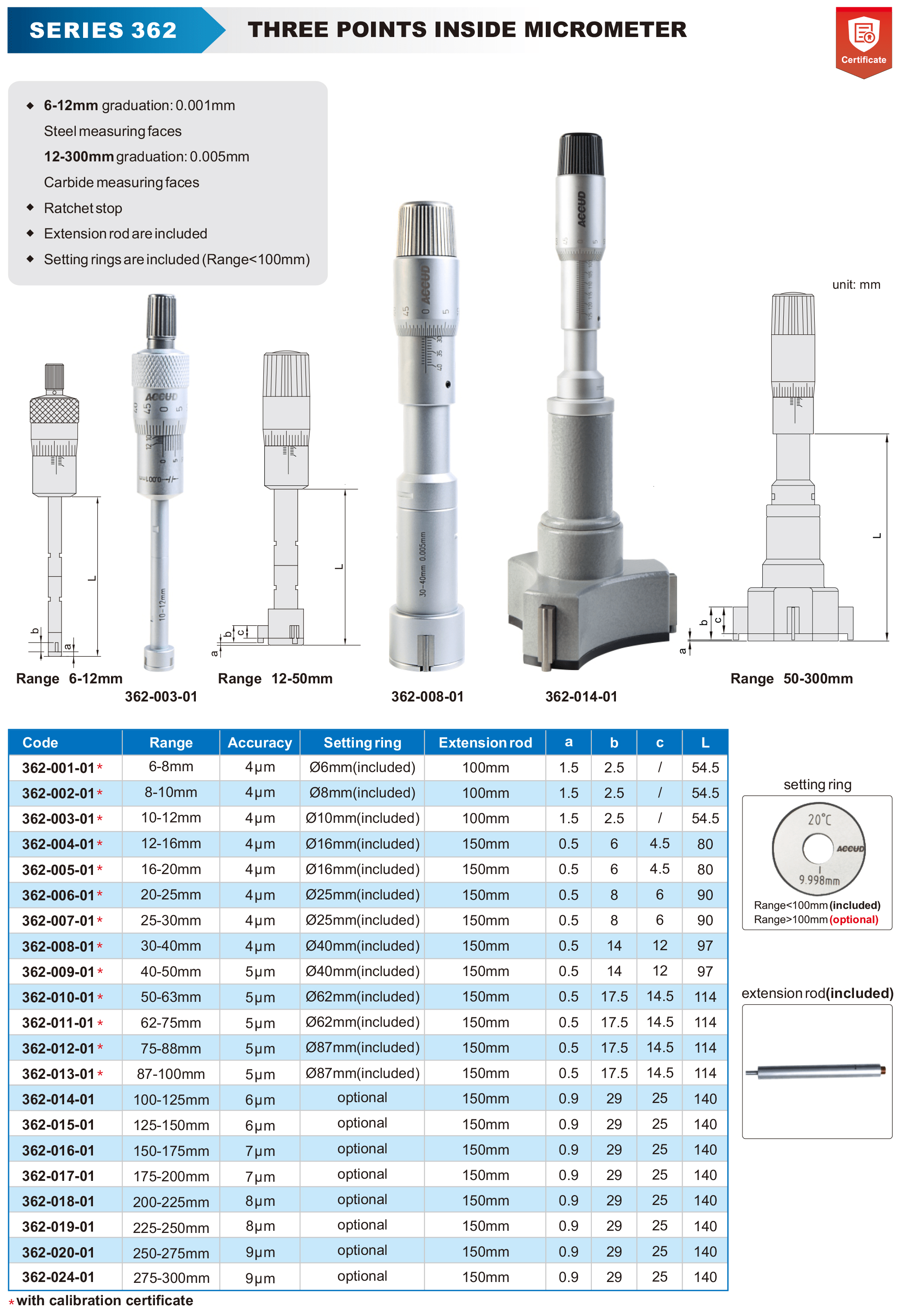 A precision measuring instrument designed to measure the internal diameter of bores, cylinders, and other similar features with high accuracy. This tool is commonly used in engineering, machining, and quality control to ensure that internal dimensions meet specified tolerances. Unlike traditional inside micrometers, the three-point contact system allows for more stable and reliable measurements, particularly in larger bores.