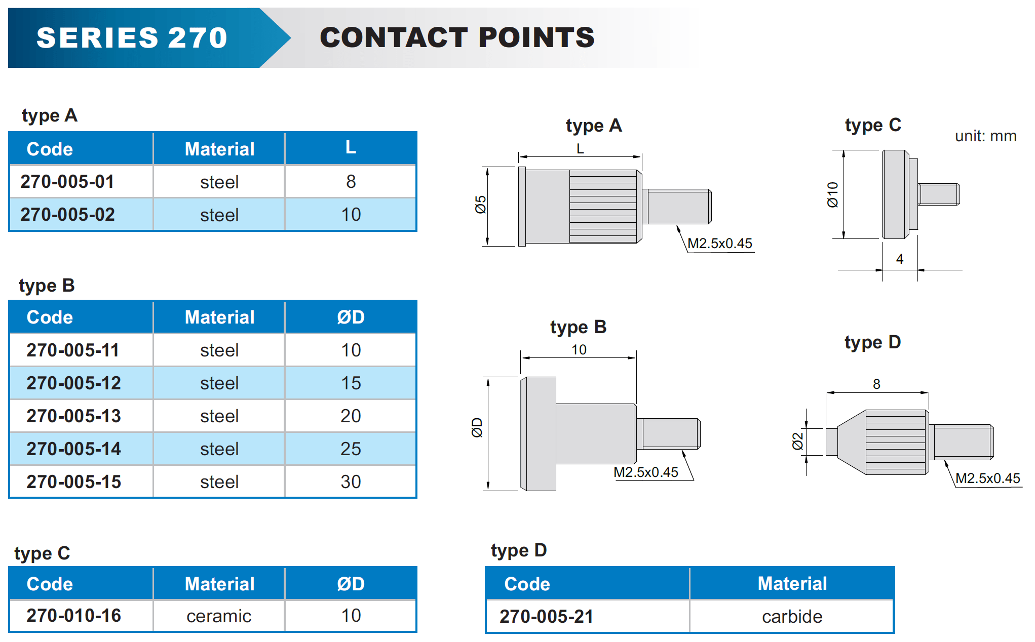 - Roller tip: Used for measuring round surfaces and reduces friction.