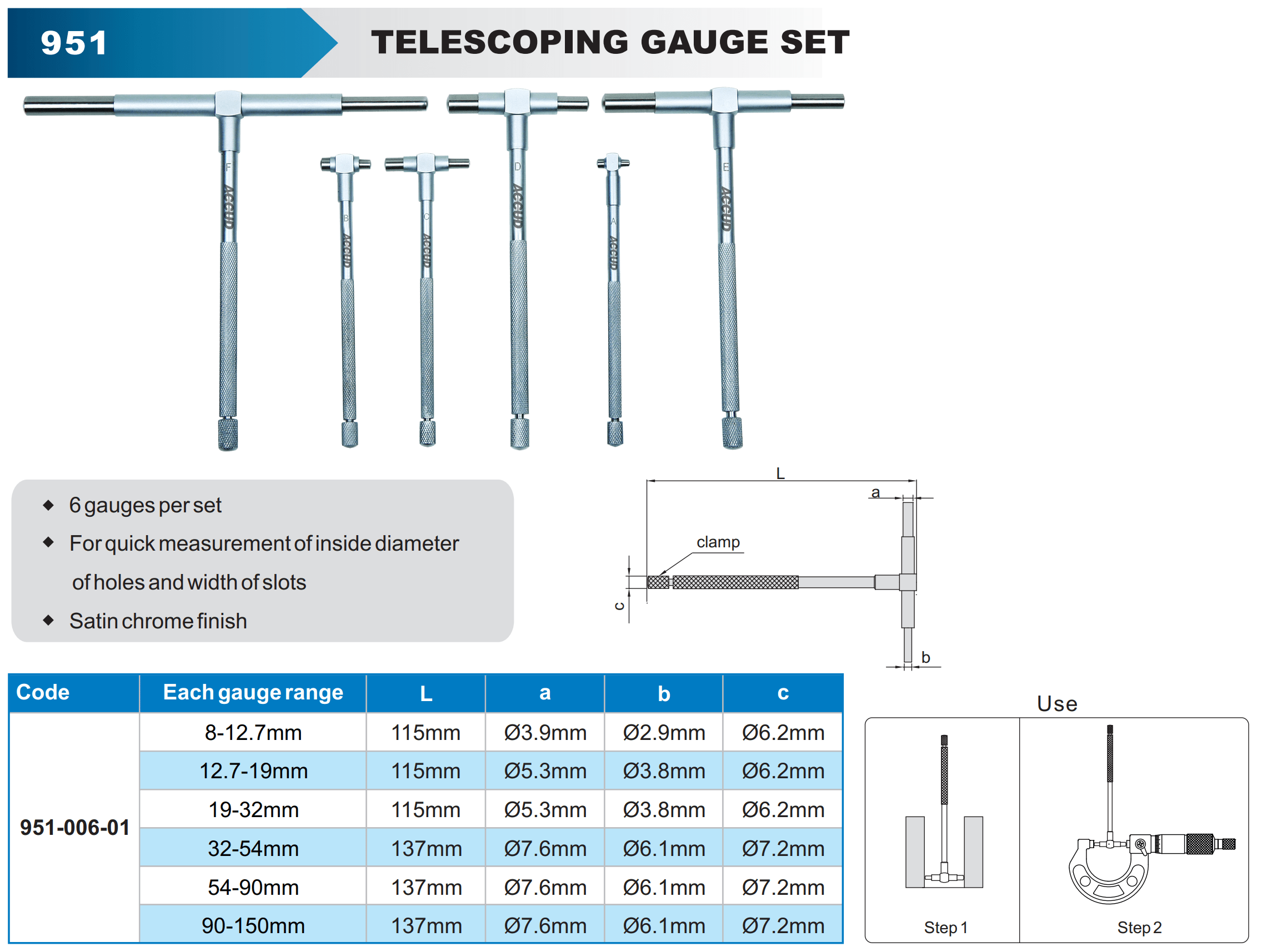 - For quick measurement of inside diameter of holes and width of slots