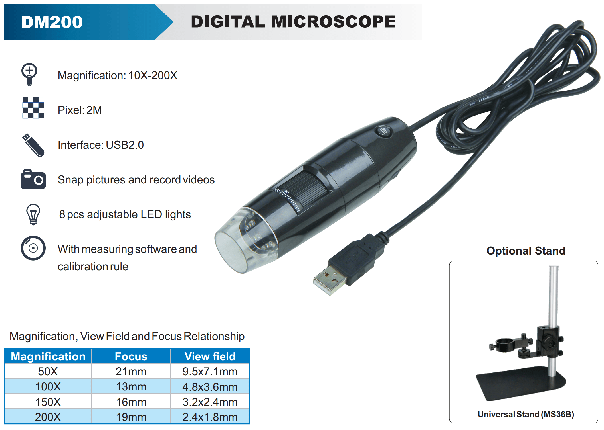 - High Magnification and Resolution: These microscopes typically offer variable magnification levels, often ranging from 10x up to 400x or more, depending on the model. The digital sensor provides 2 Mega Pixel high-resolution images, which can be further analyzed on the connected device.
