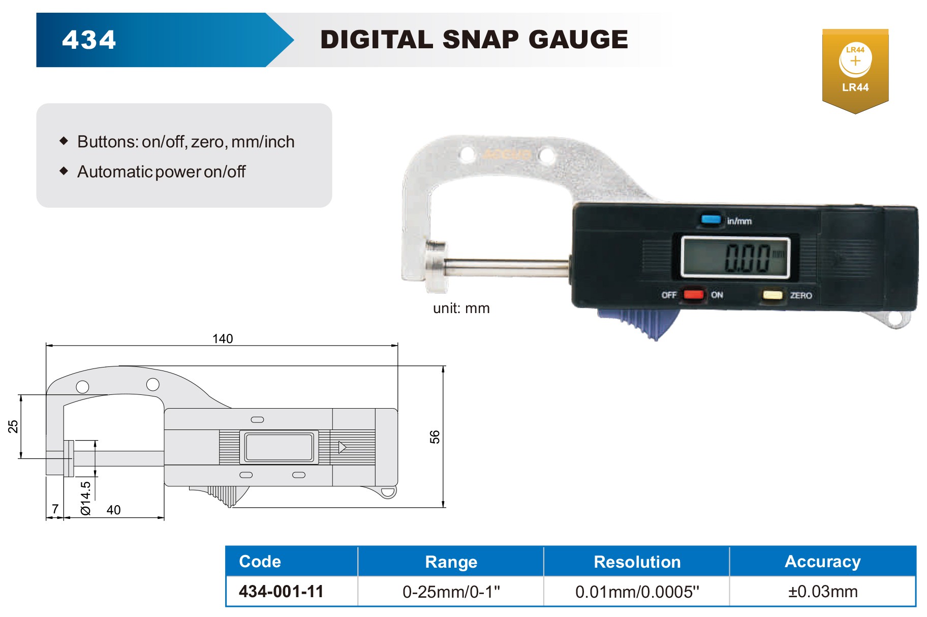 Digital Snap Gauge 0-25mm 0.01mm Res.