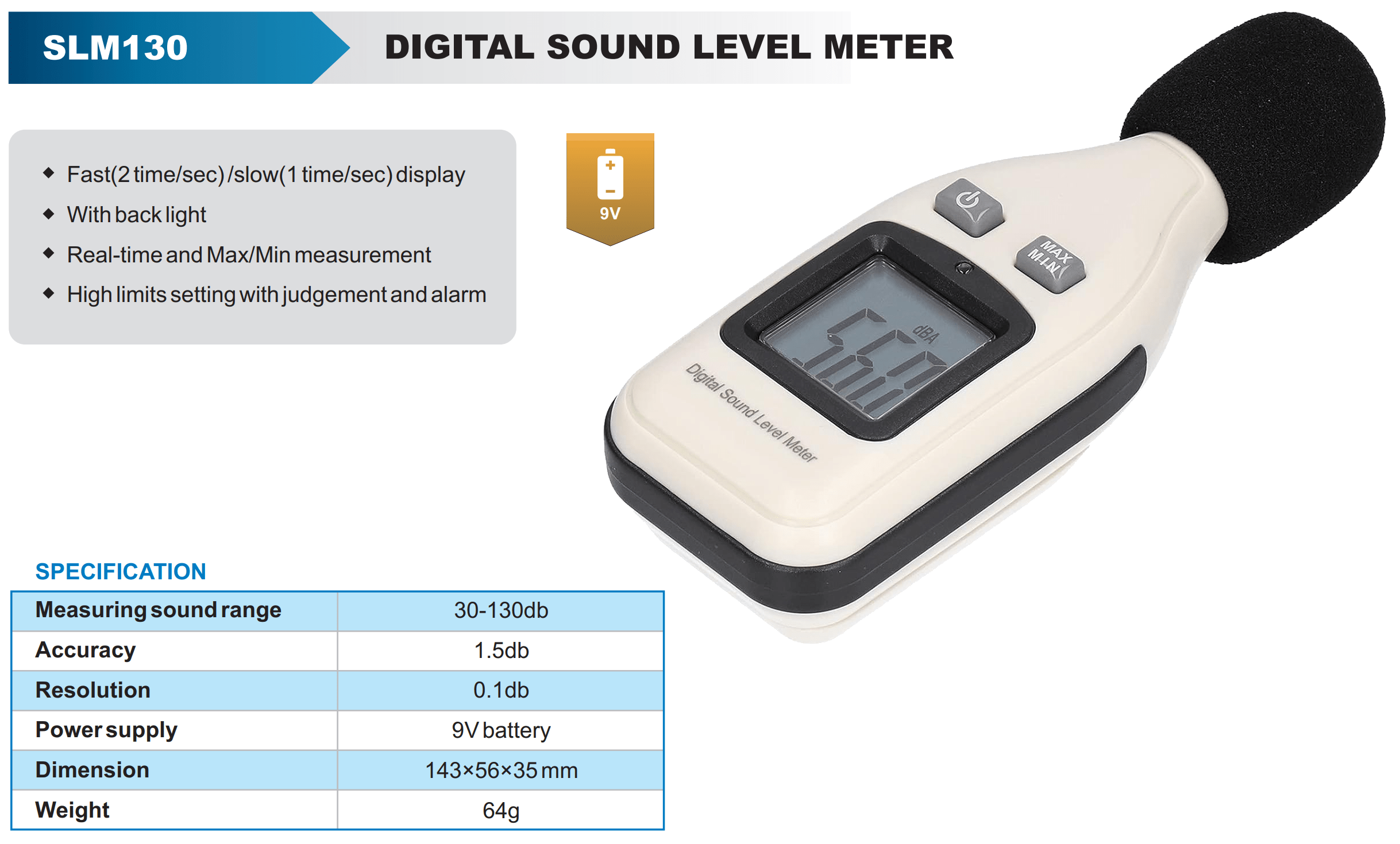 - Digital Display: The device usually features a digital LCD or LED screen that displays real-time sound level readings in decibels, often with additional information such as maximum, minimum, and average sound levels.