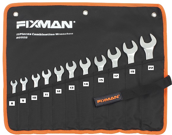 FIXMAN set of p combination wrenches in a pouch. These combination wrenches are made of durable chrome vanadium steel (40Cr-V). The design includes a non-slip surface and micro finish. The set includes sizes 8 to 22 mm.