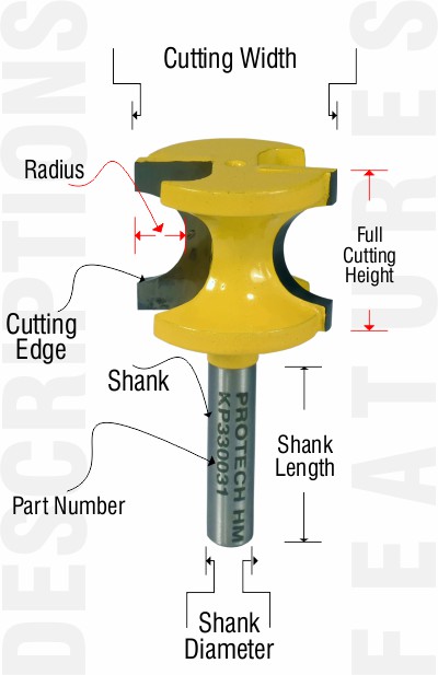 This router bit is used for creating a convex shaped profile on the side of the workpiece in one pass producing a perfect half radius bull nose profile