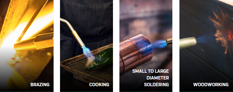 It is pressure regulated for consistent performance when inverted, making it ideal for large diameter soldering, light brazing, woodworking and cooking.